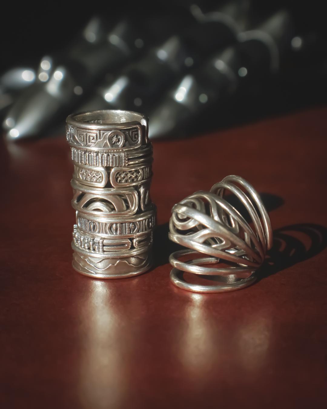 A hardwood background with silver patina rings from the Mending Collection by Melissa Ng of Lumecluster. There’s multiple designs in the stack of 7 rings. The ring to the right is meant to go over the knuckle and act as a splint to prevent hyperextention.