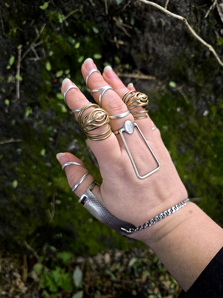 MossRings04 by Coyote in Zebra Clothing|Published 03February2026-at dimensions 750 × 1000 Images navigation Previous Next You can clearly see the eye design from the top Hand against a black rock with moss showcasing a hand full of splints made to support hypermobility in the hand. These include swan neck designs, eds ring, thumb shield, and celestial eye design from lumecluster
