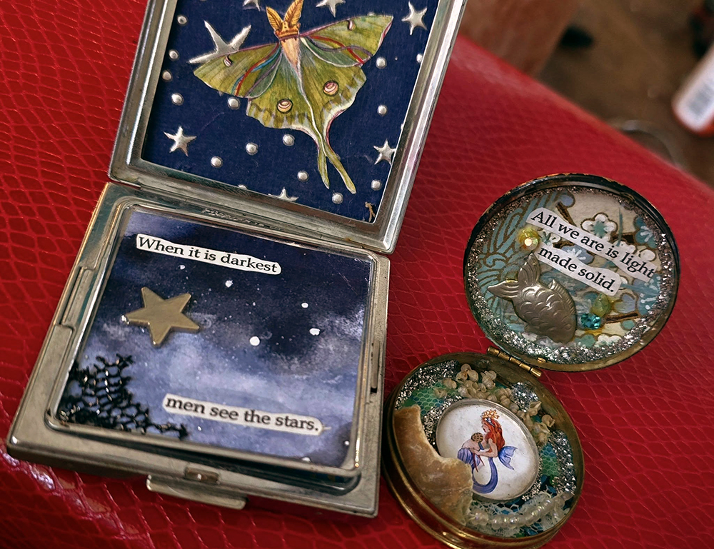 Two repurposed makeup compacts. The one on the left is a french blush that is square and silver. The top mirror has been covered with midnight blue and raised silver stars with a miniature painting of a luna moth. The bottom protective door of the compact has a cloudy night sky with a gold star and two clippings with words. The top clipping reads “When it is darkest” and the bottom reads “men see the stars. The compact on the right is smaller and round. The lid is decorated in green and pale floral background with a yellow and green rhinestone and silver fish charm. There’s 2 strips of paper that read “All we are is light made whole”. On the bottom is a center circle with a tiny painting of a red haired mermaid with a blue tail. Along the top of her is a cluster of baby whelk shells, below is a small chip of whelk. There’s a circle of silver glitter around her. Both pieces were made by the late E.M. Corsa of North Carolina.